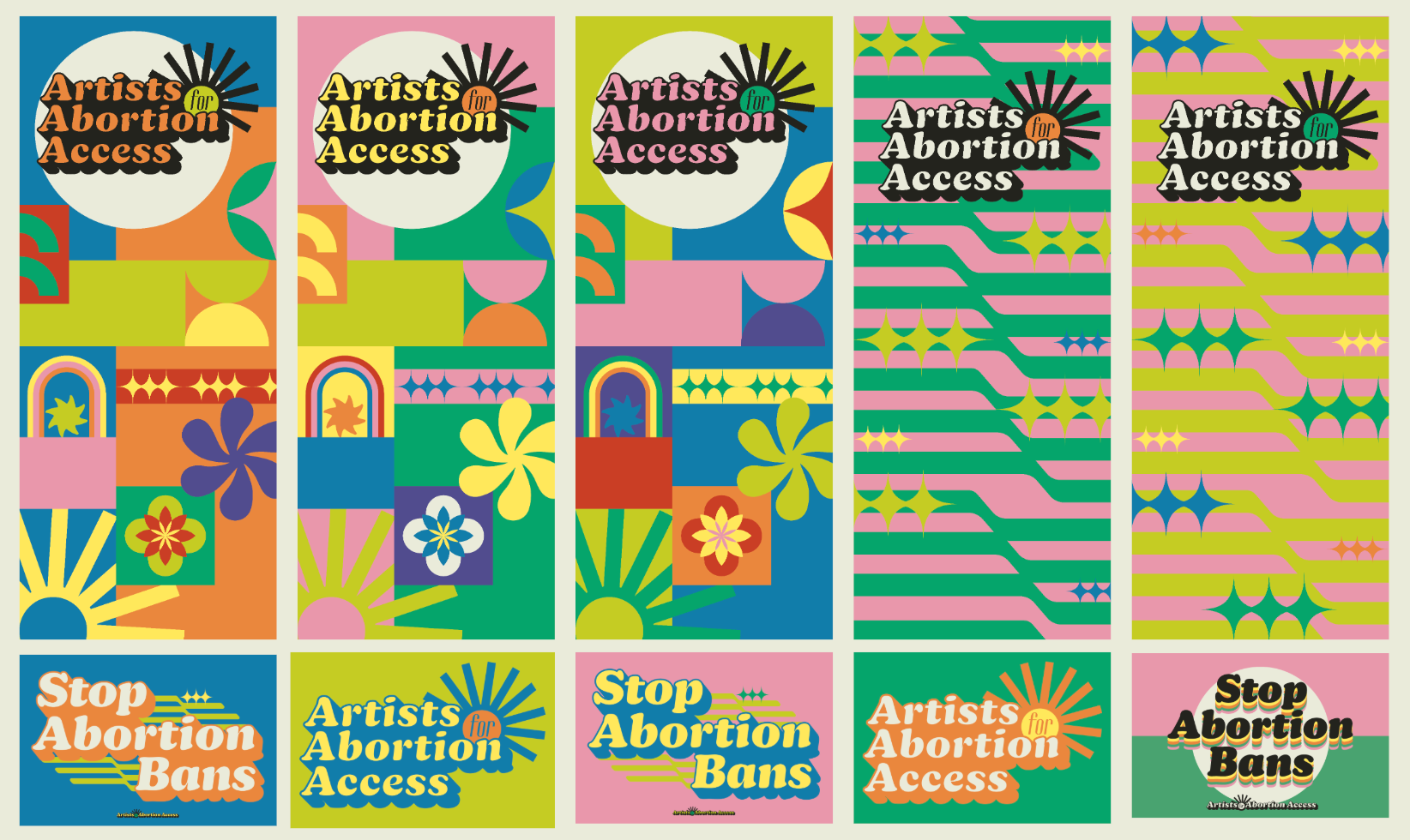 As a sub-brand, this project required a color palette extension and a logo exploration. I leaned into retro motifs as a nod to the F&J pillar of 70's Roe v. Wade and wanted to create a burst of color in representation of the artists that would be working with us and to stand out in the hosted locations.