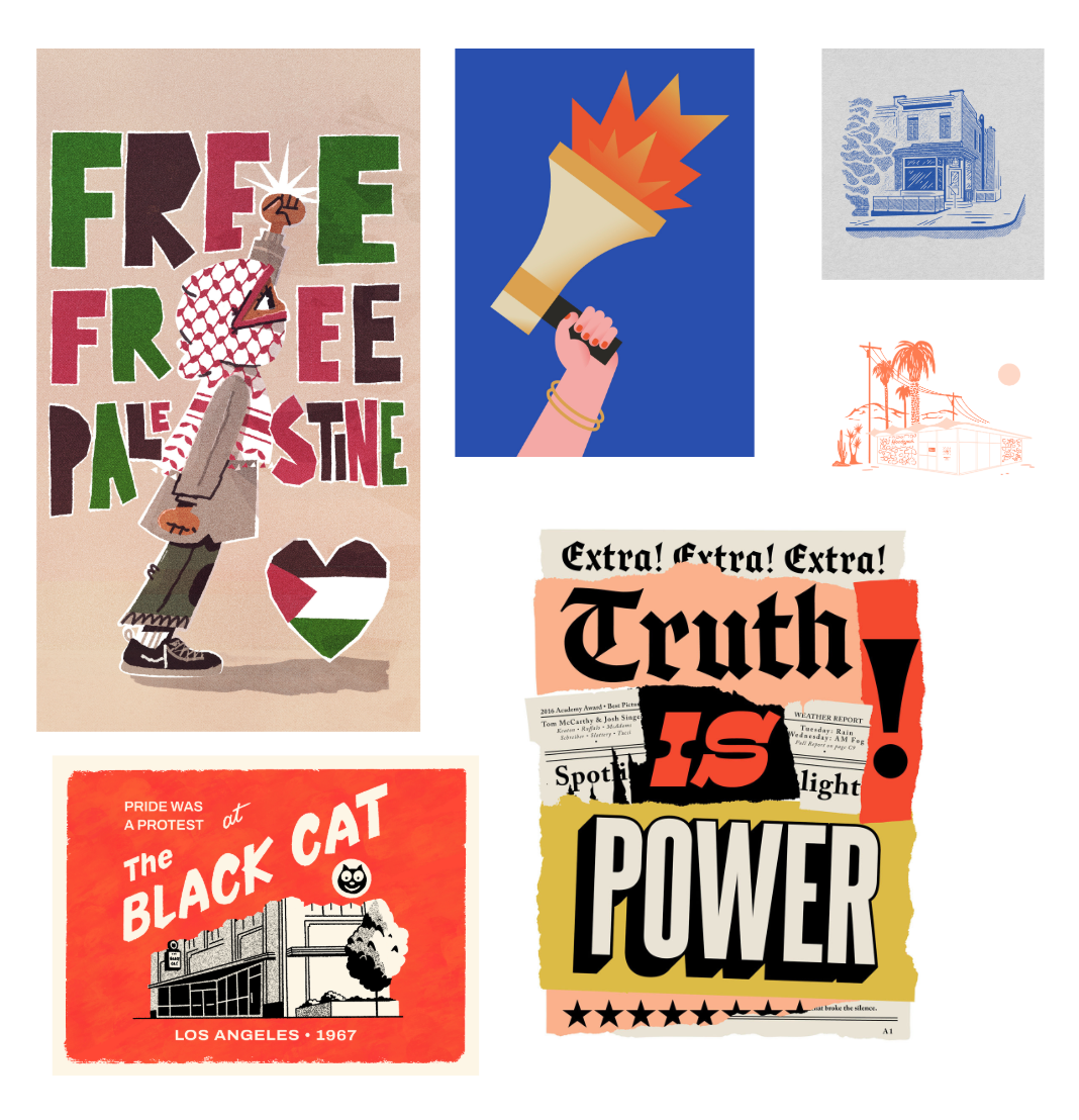I decided to use bold typography as the main focus with protest imagery. The text is meant to be fluid to reflect shouting and the megaphone layout was inspired by the Statue of Liberty.